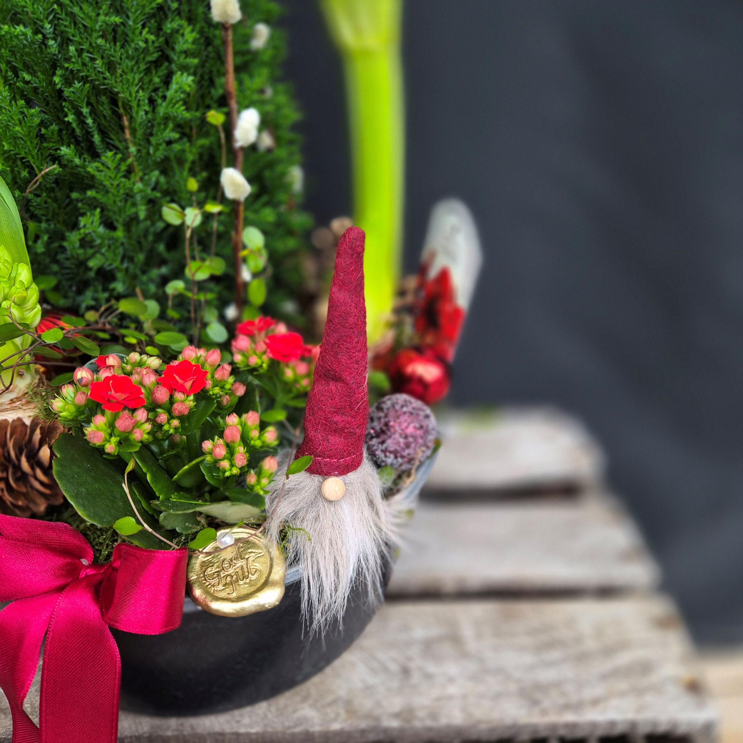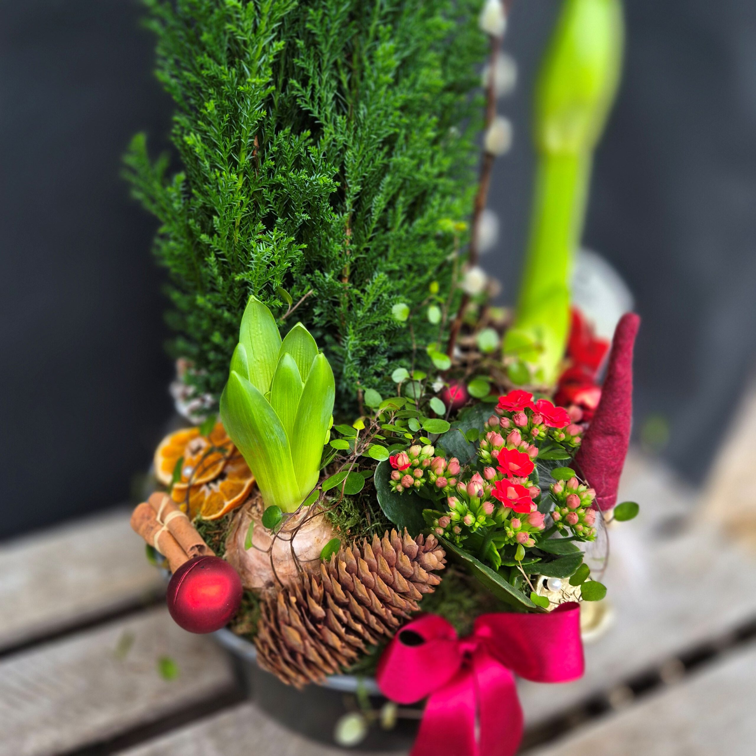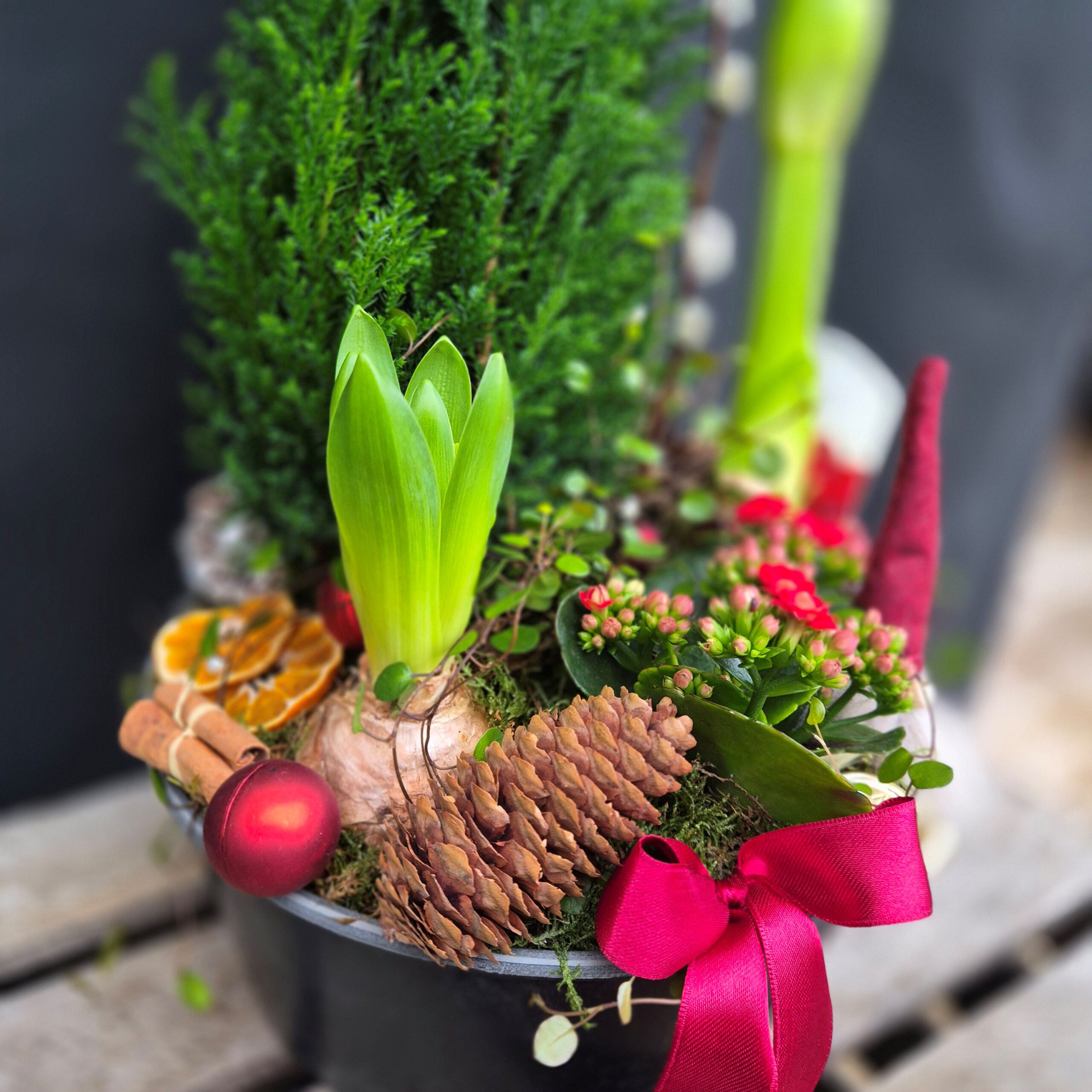 Röd amaryllis, vit hyacint, röd kalanchoe, plättar i luften och ädelcypress. Kruka: h=10cm, d=24cm(Går även att få i vitt färgtema, ange det i så fall i kommentar vid beställning)