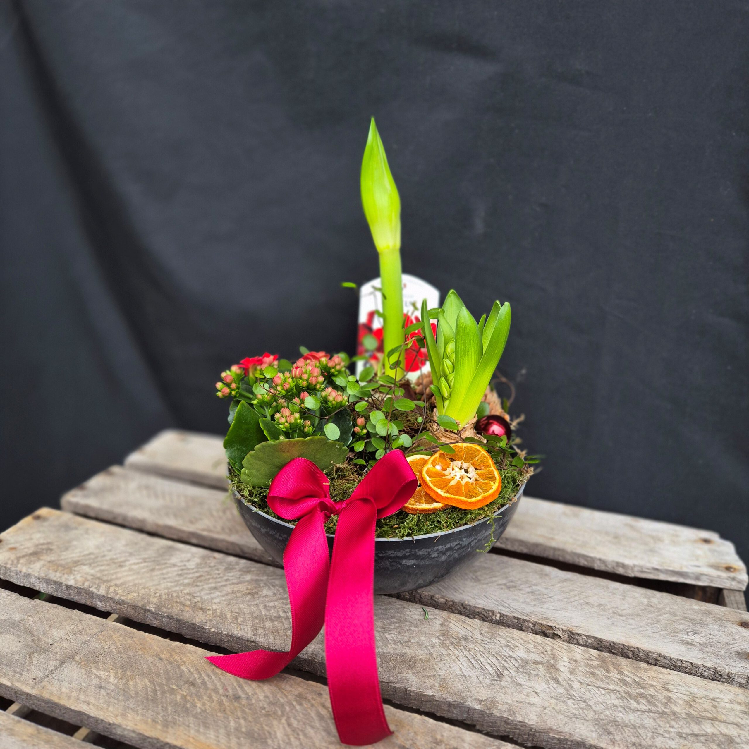 Röd amaryllis, vit hyacint, röd kalanchoe och plättar i luften. Kruka: h=7cm d=20cm