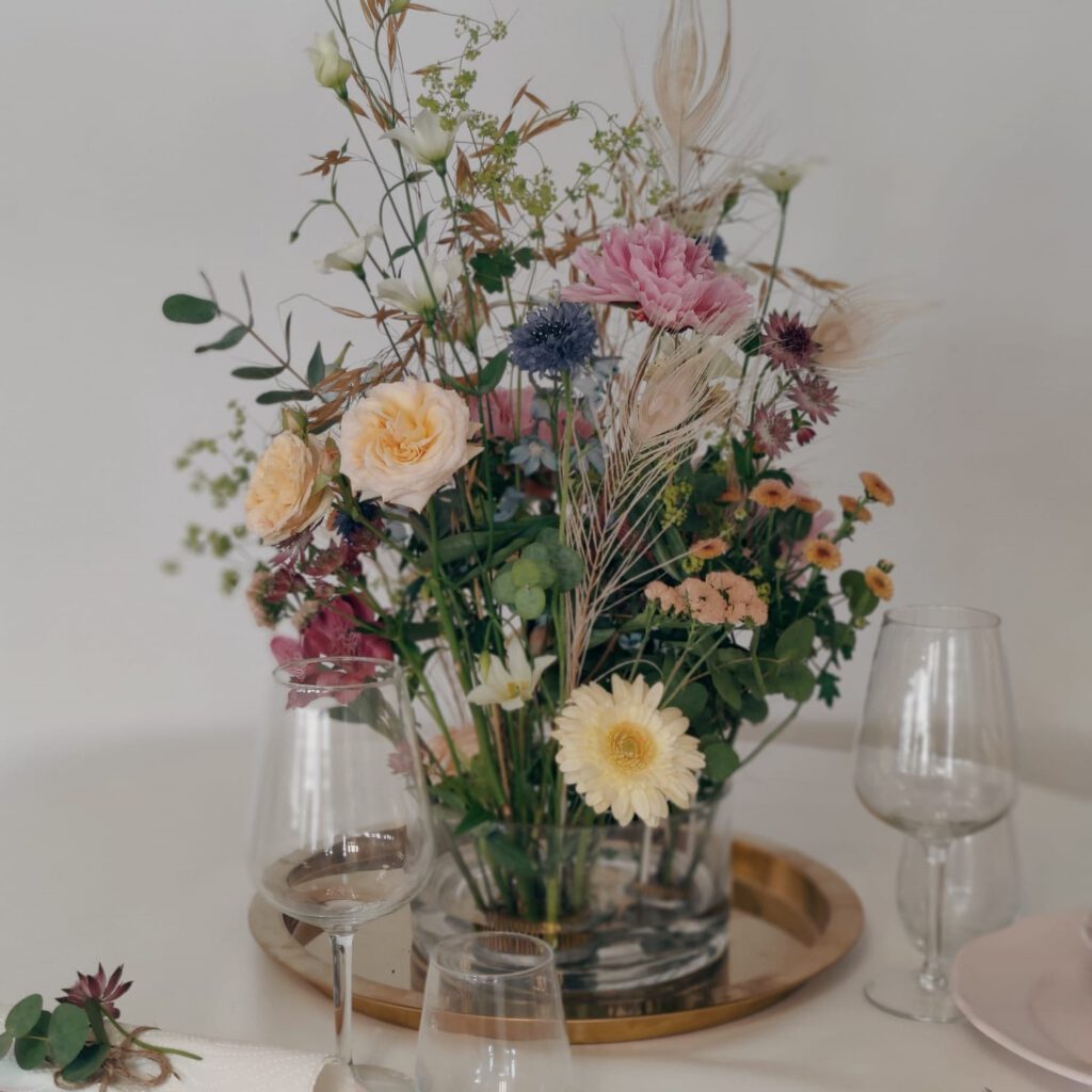 Jag kan exempelvis skapa en vacker honnörsbordsdekoration eller dekorationer till vigselplatsen.